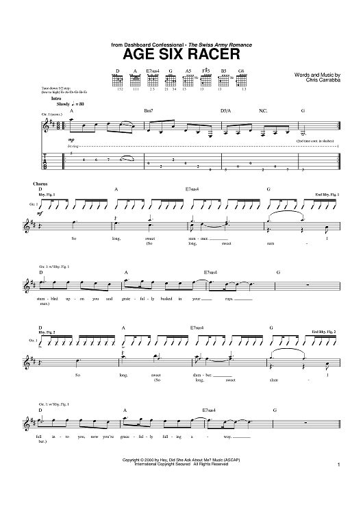 Digital Sheet Music for Age Six Racer by Chris Carrabba, Dashboard Confessional scored for Guitar Tab; id:391078