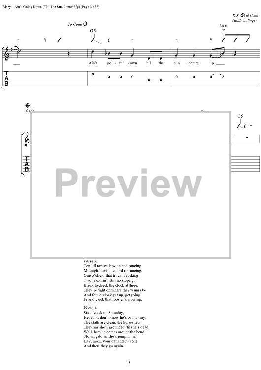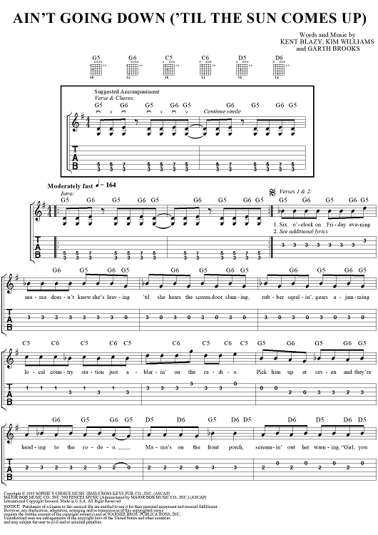Digital Sheet Music for Ain't Going Down ('Til the Sun Comes Up) by Garth Brooks, Kent Blazy, Kim Williams scored for Easy Guitar Tab/Vocal; id:118885