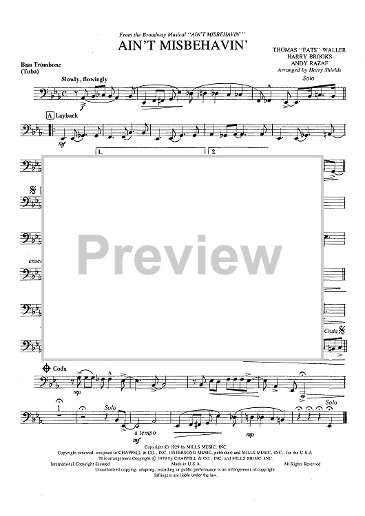 "Ain't Misbehavin' - Bass Trombone" Sheet Music by Fats Waller