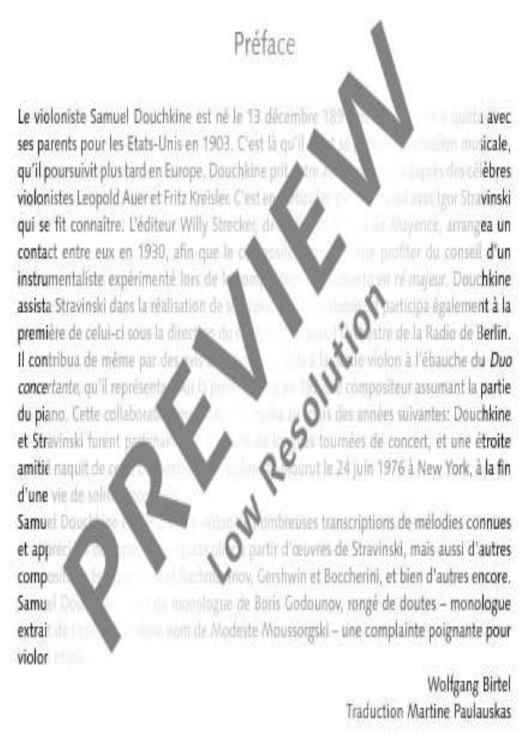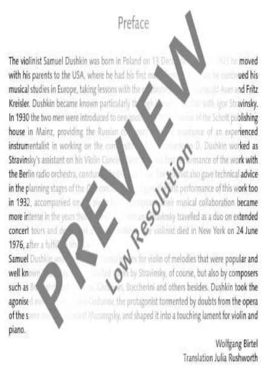 Samuel Dushkin wrote several violin transcriptions of then known and popular melodies, naturally taken from works by his friend Stravinsky, but also by other composers such as Bizet and Rakhmaninov, Gershwin and Boccherini, and others. Dushkin formed a deeply moving lament for violin and piano out of the monologue of self-doubting Boris Godunov from the opera of the same name by Modest Mussorgsky.
