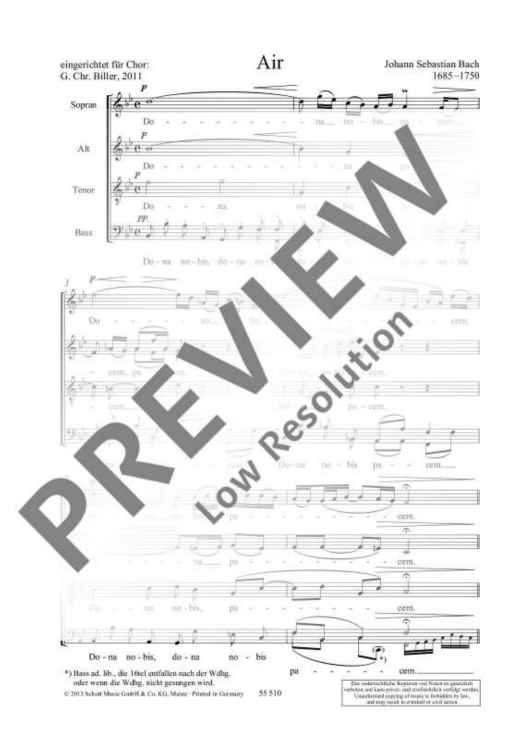 Georg Christoph Biller, choirmaster of St. Thomas' Church in Leipzig, set out to arrange the probably most popular instrumental piece of his great predecessor in this position: the famous 'Air' from the Suite for Orchestra No. 3. In this work, he does without the vocalises commonly used in arrangements for choir or solo voices but combines the music with the central Christian wish for eternal peace.