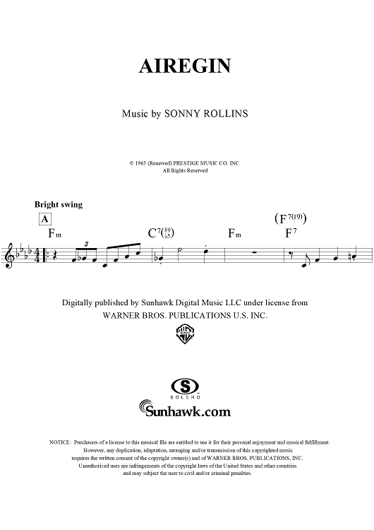 Digital Sheet Music for Airegin by Sonny Rollins scored for Lead Sheet; id:287632