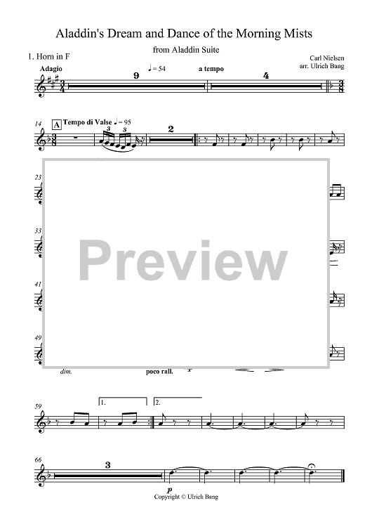 Digital Sheet Music for Aladdin's Dream and Dance of the Morning Mists - Horn in F 1 by , Carl Nielsen, Ulrich Bang scored for Brass Ensemble; id:419712