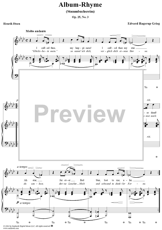 Digital Sheet Music for Album-Rhyme, Op. 25, No. 3 by Edvard Grieg, Henrik Ibsen scored for Voice/Piano; id:303601