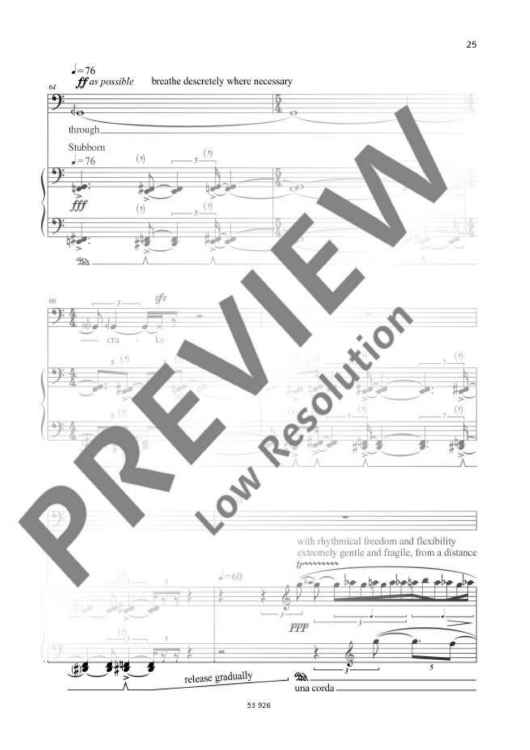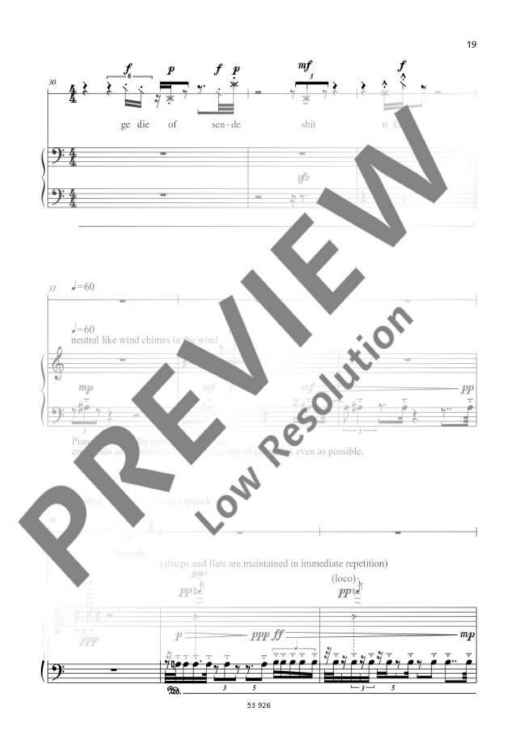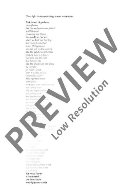 The text is divided into a few braided inner voices. This became the main compositional idea of the piece. It is an intense inner conversation or conflict within one person. The background to this conflict can be summed up as following: A man has left his family, his wife and children. He is walking in a forest, hunted by all his conflicting emotions. He sees a lake, and walks into the lake, to die. Chaya Czernowin