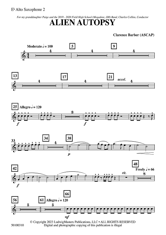 Digital Sheet Music for Alien Autopsy - Eb Alto Saxophone 2 by Clarence Barber scored for Concert Band; id:509616