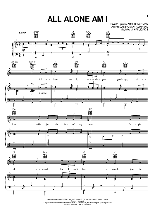 Digital Sheet Music for All Alone Am I by Manos Hadjidakis, Arthur Altman, Brenda Lee, Jean Ioannidis scored for Piano/Vocal/Chords; id:384604