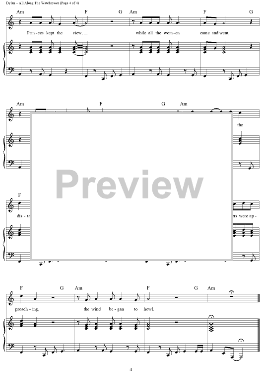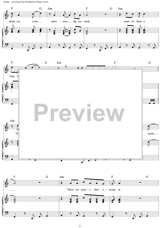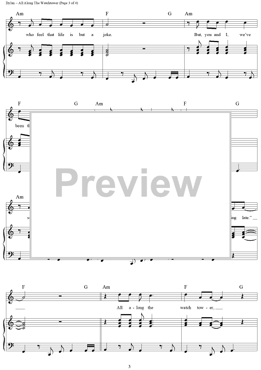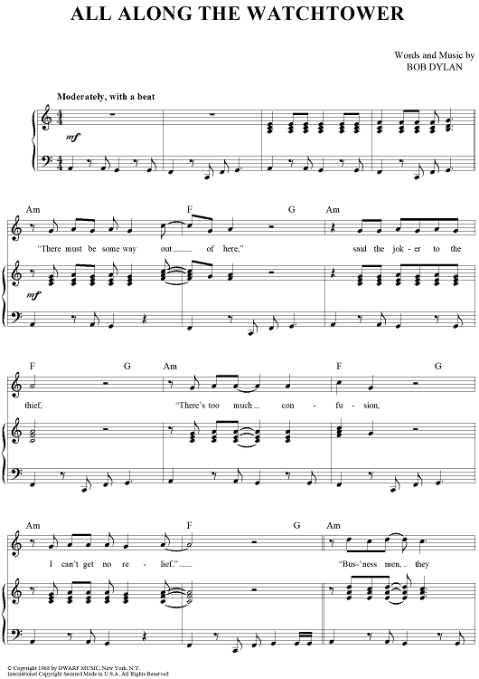 Digital Sheet Music for All Along The Watchtower by Bob Dylan, Jimi Hendrix scored for Piano/Vocal/Chords; id:428443