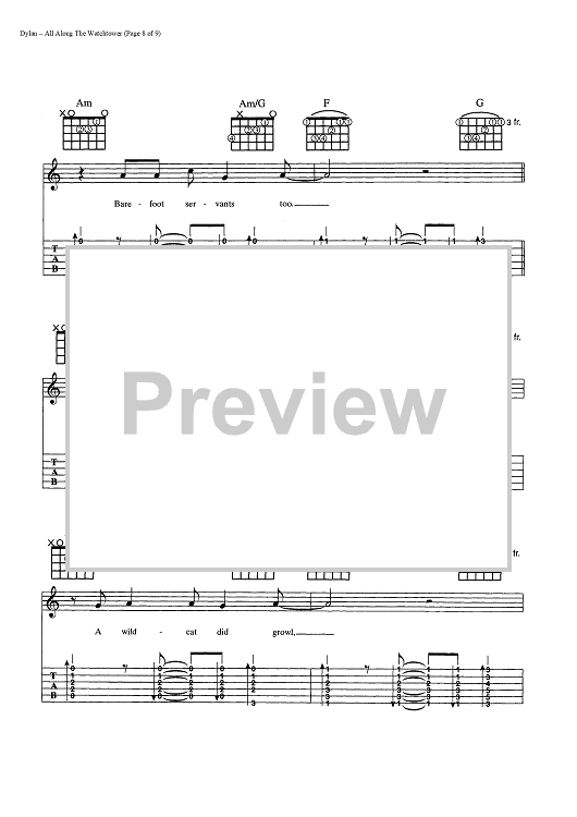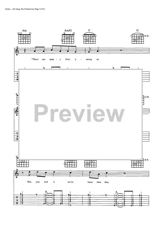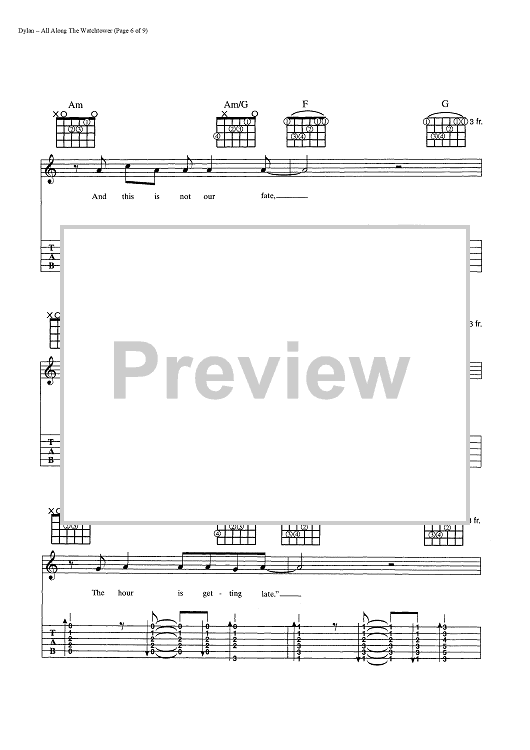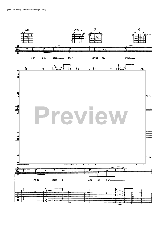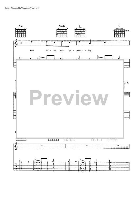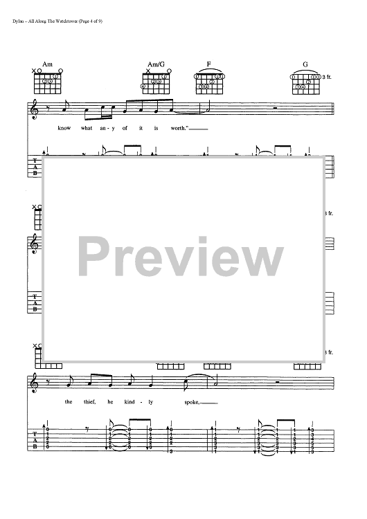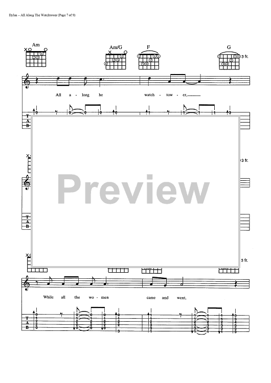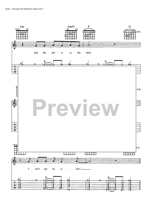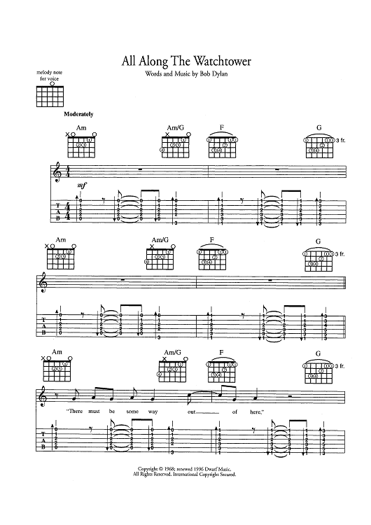 Digital Sheet Music for All Along The Watchtower by Bob Dylan scored for Guitar Tab/Vocal/Chords; id:445022