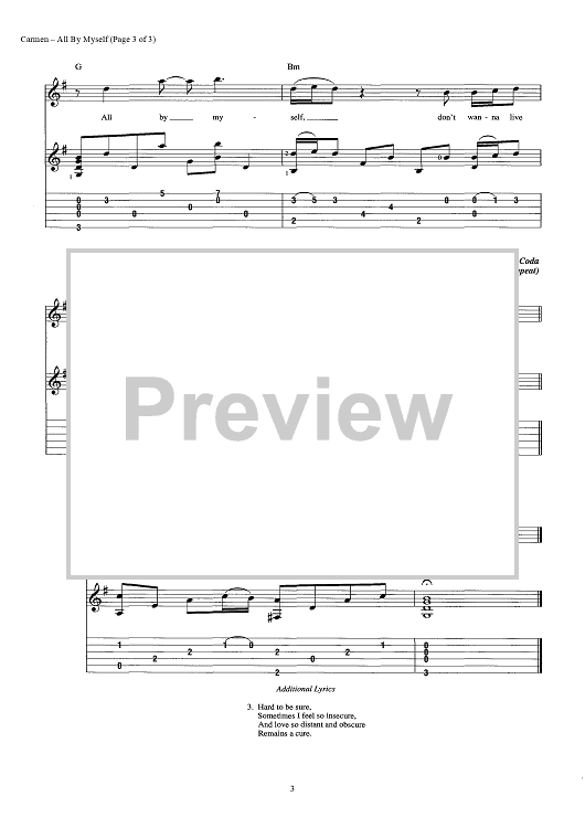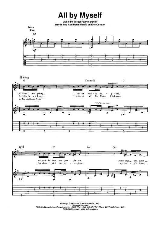 Digital Sheet Music for All By Myself by Eric Carmen, Sergei Rachmaninoff scored for Guitar Tab/Vocal/Chords; id:442898