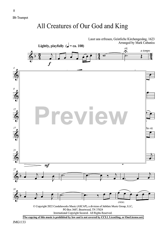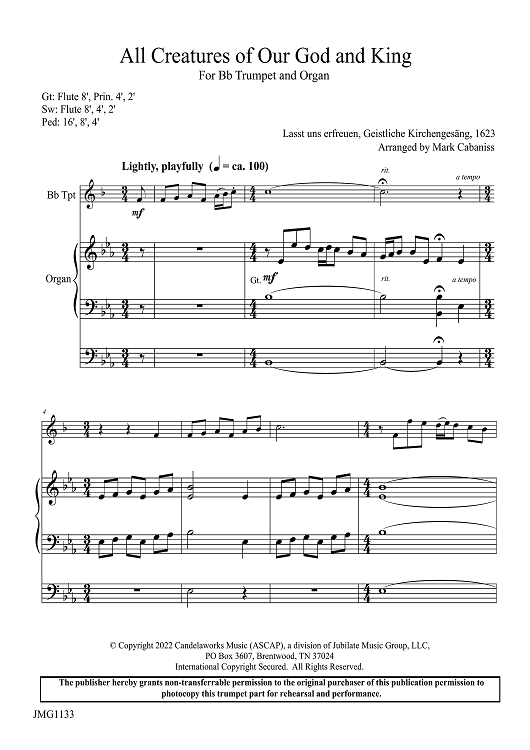 This setting of a classic and beloved hymn for trumpet and organ is perfect as a brisk call to worship or offertory. Using a “variations on a theme” approach, the hymn tune is explored with different treatments…from playful and celebrative to majestic and triumphant.