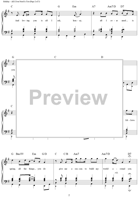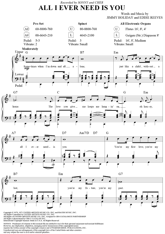 Digital Sheet Music for All I Ever Need Is You by Jimmy Holiday, Eddie Reeves, Sonny & Cher scored for Easy Organ/Vocal; id:266506