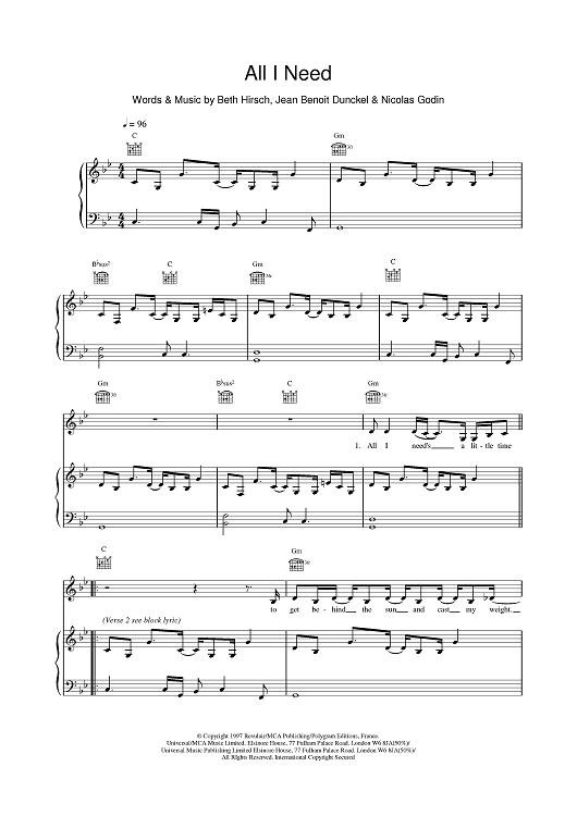 Digital Sheet Music for All I Need by Air, Jean-Benoit Dunckel, Nicolas Godin, Beth Hirsch scored for Piano/Vocal/Chords; id:380029