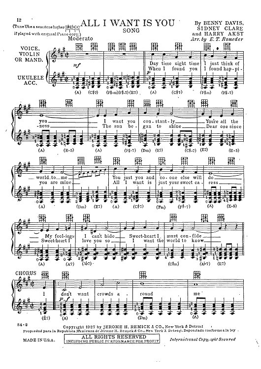 Digital Sheet Music for All I Want Is You by , Harry Akst, Benny Davis, Sidney Clare, E. T. Romeder scored for Ukulele; id:418688