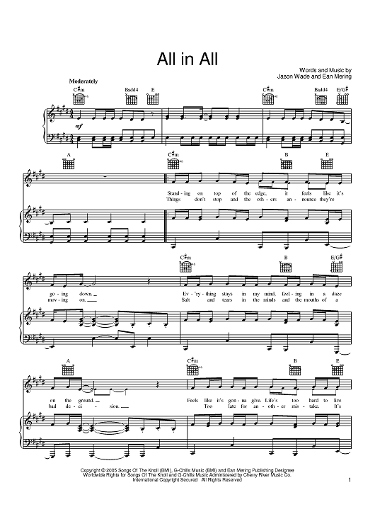 Digital Sheet Music for All In All by Jason Wade, Lifehouse, Ean Mering scored for Piano/Vocal/Chords; id:389896