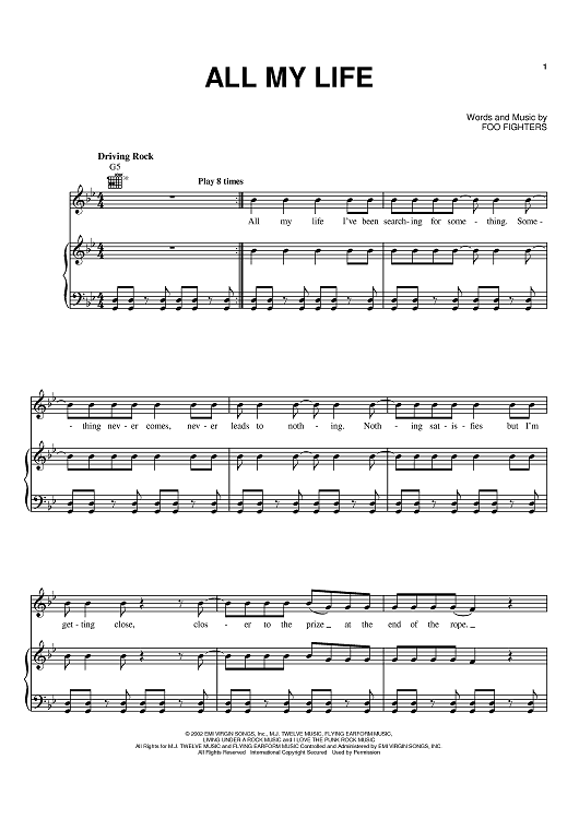 Digital Sheet Music for All My Life by Foo Fighters scored for Piano/Vocal/Chords; id:370197
