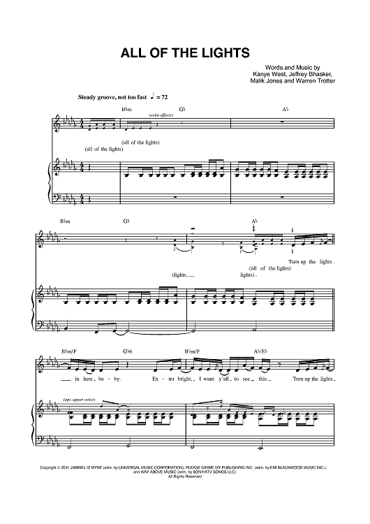 Digital Sheet Music for All Of The Lights by Kanye West, Jeff Bhasker, Malik Jones, Warren Trotter scored for Piano/Vocal/Chords; id:419468