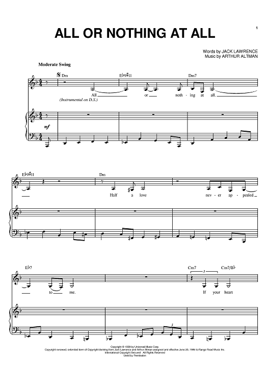 Digital Sheet Music for All Or Nothing At All by Frank Sinatra, Ella Fitzgerald, Arthur Altman, Jack Lawrence, Diana Krall, Harry James scored for Piano/Vocal/Chords; id:387409