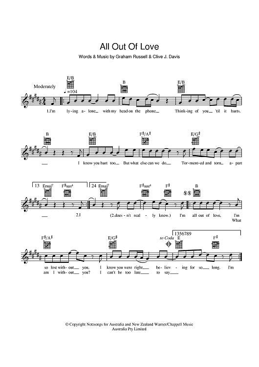 Digital Sheet Music for All Out Of Love by Air Supply, Graham Russell, Clive Davis scored for Lead Sheet; id:401883