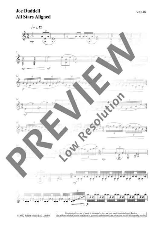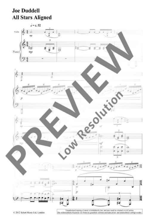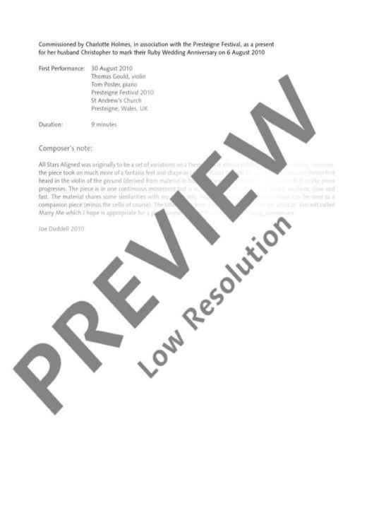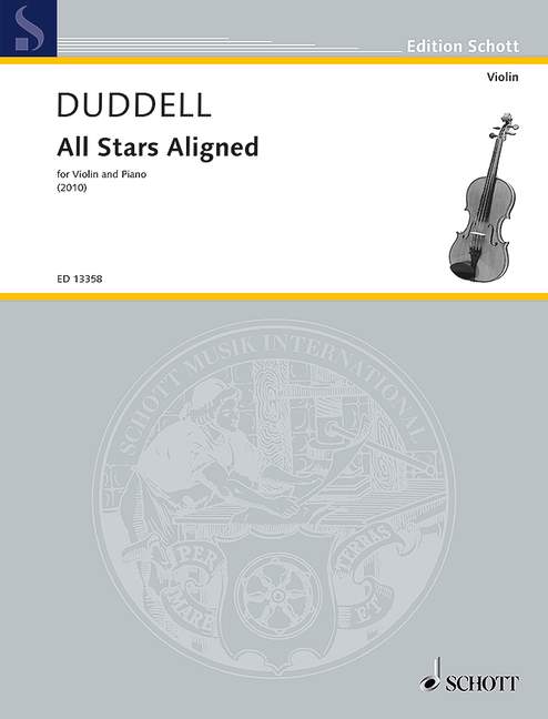 All Stars Aligned was originally to be a set of variations on a theme that is almost hidden in the opening bars. However, the piece took on much more of a fantasia feel and shape as I wrote it and it could be argued that a second theme first heard in the violin of the ground (derived from material in bar 5) becomes more dominant than the first as the piece progresses. The piece is in one continuous movement but is in three distinct sections and tempi: medium, slow and fast. The material shares some similarities with my piano trio, Nightswimming, and in some ways can be seen as a companion piece (minus the cello of course). The title comes from a track on an album by the artist St. Vincent called Marry Me which I hope is appropriate for a piece commissioned to celebrate a wedding anniversary.Joe Duddell 2010