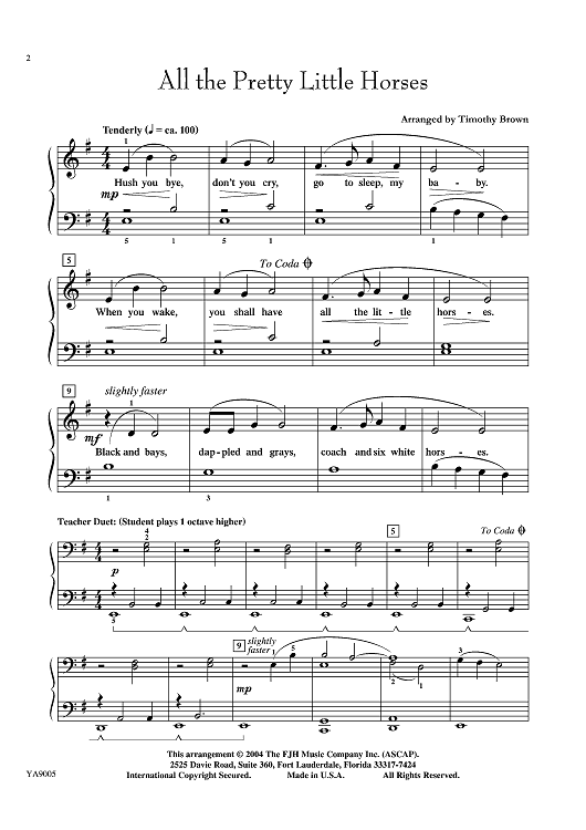 Timothy Brown's arrangement of this American traditional children's lullaby is hauntingly beautiful. There is a minimum of moves, and the optional teacher duet adds just the right touch for a sophisticated ensemble performance.