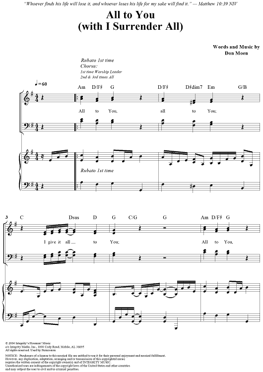 "All To You (with I Surrender All)" Sheet Music by Don Moen