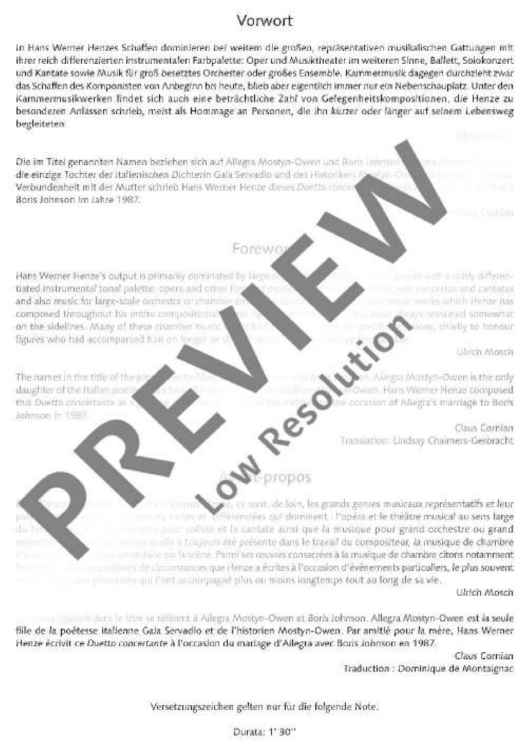 The names in the title of the piece refer to Allegra Mostyn-Owen and Boris Johnson. Allegra Mostyn-Owen is the only daughter of the Italian poetess Gaia Servadio and the historian William Mostyn-Owen. Hans Werner Henze composed this Duetto concertante as a gesture of friendship towards the mother on the occasion of Allegra’s marriage to Boris Johnson in 1987. Hans Werner Henze’s output is primarily dominated by large-scale, representative musical genres with a richly differentiated instrumental tonal palette: opera and other forms of musical theatre works, ballet, solo concertos and cantatas and also music for large-scale orchestra or chamber ensemble. In contrast, the chamber music works which Henze has composed throughout his entire compositional career right up to the present day have always remained somewhat on the sidelines. Many of these chamber music works had been composed for specific occasions, chiefly to honour figures who had accompanied him on longer or shorter stretches of his journey through life.