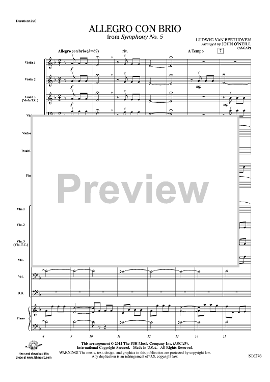 Digital Sheet Music for Allegro Con Brio - Score by Ludwig van Beethoven, John O'Neill scored for String Orchestra; id:432018