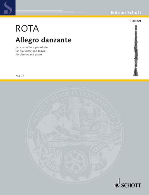 The three-part albumleaf for clarinet and piano shows Rota's unique inventiveness and his unerring sense of atmospherically dense harmonies. The clarinet plays catchy, song-like motifs which develop a graceful charm by means of sequence-like continuation, accompanied by an easily playable, beautiful piano part. Allegro danzante is perfect as a charming performance piece for clarinet pupils.