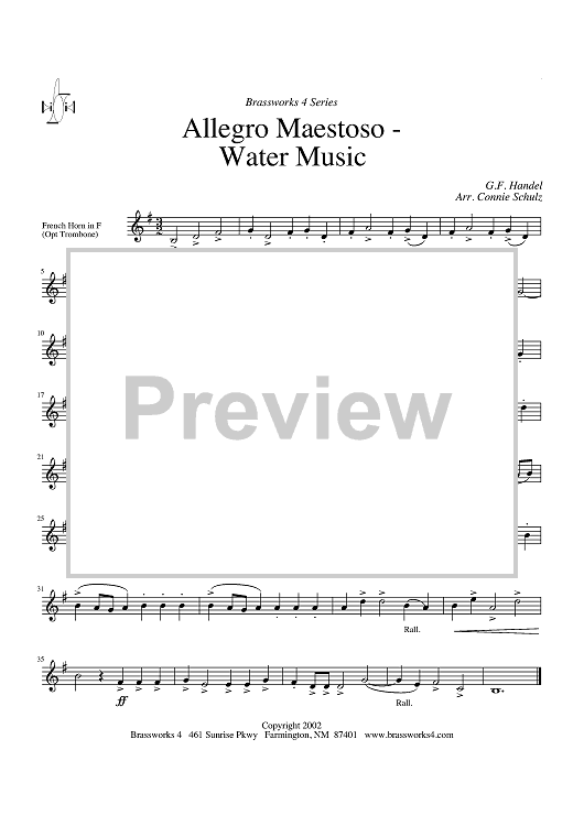Digital Sheet Music for Allegro Maestoso - Water Music - Horn in F by George Frideric Handel, Connie Schulz scored for Brass Quartet; id:316466