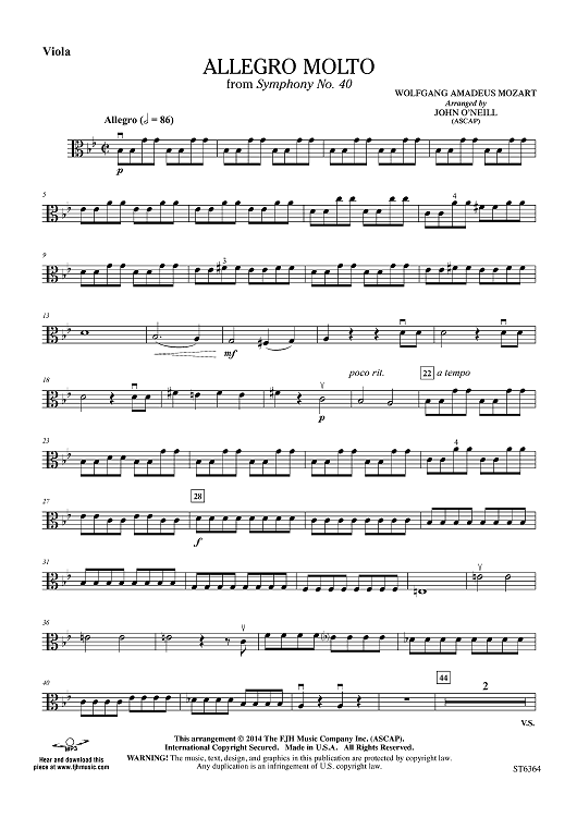 Digital Sheet Music for Allegro Molto from Symphony No. 40 - Viola by Wolfgang Amadeus Mozart, John O'Neill scored for Orchestra; id:448345
