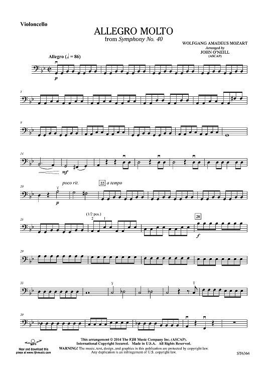 Digital Sheet Music for Allegro Molto from Symphony No. 40 - Violoncello by Wolfgang Amadeus Mozart, John O'Neill scored for Orchestra; id:448346