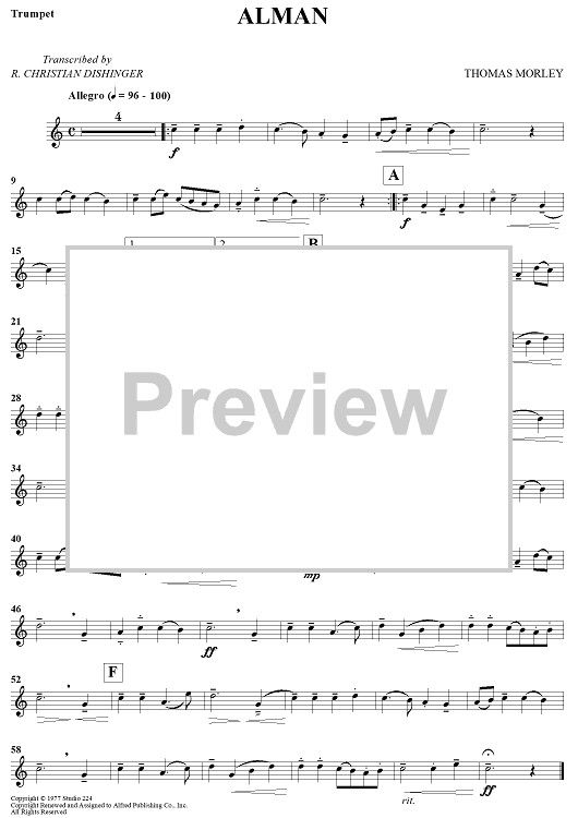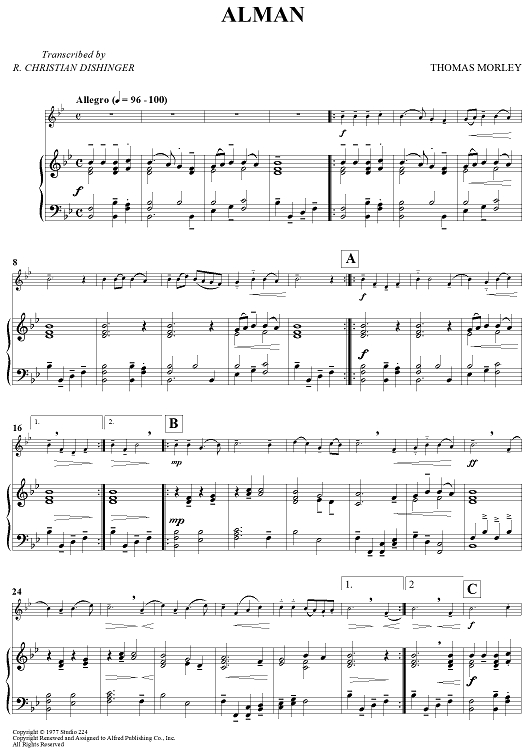 Digital Sheet Music for Alman by Thomas Morley, R. Christian Dishinger scored for Bb Trumpet/Piano; id:436588