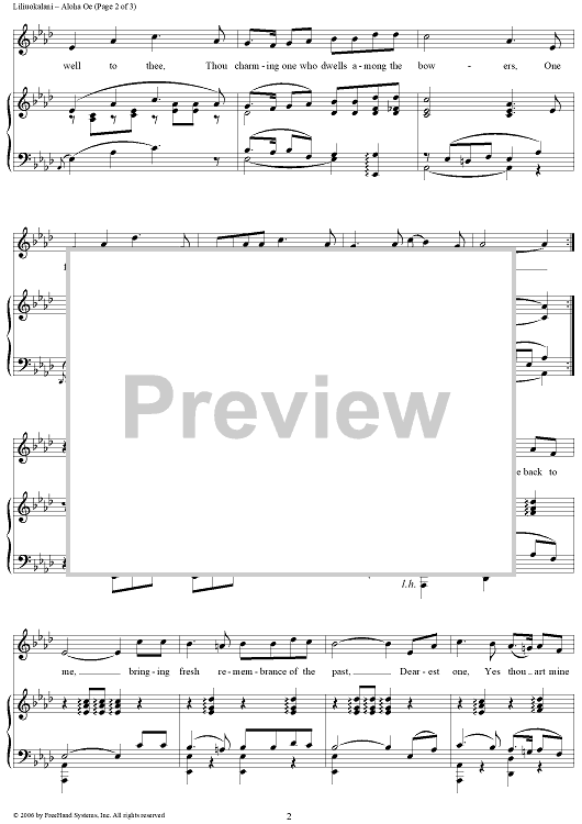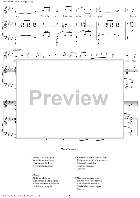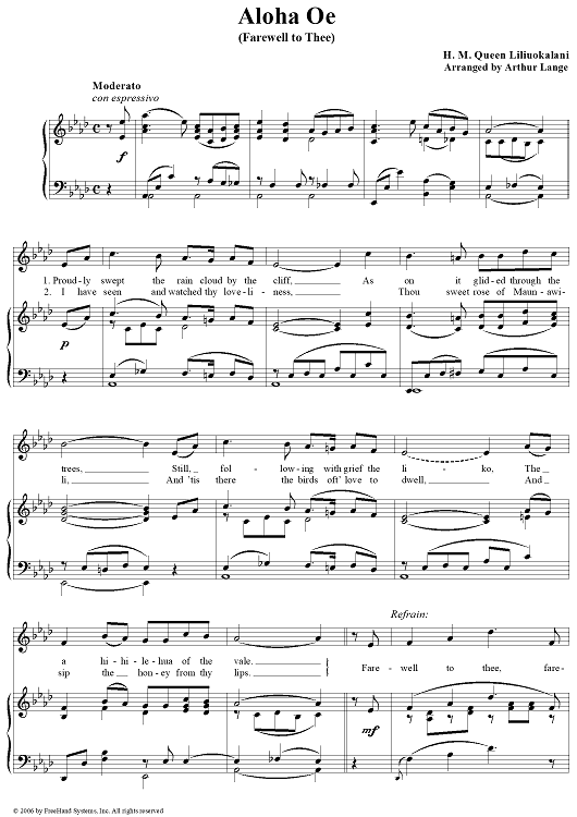 Digital Sheet Music for Aloha Oe (Farewell to Thee) by Queen of the Hawaiian Islands Liliuokalani scored for Piano/Vocal; id:320912