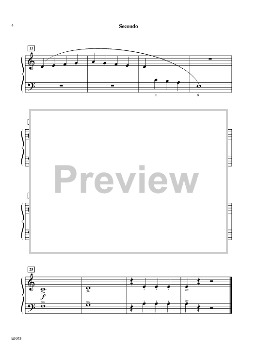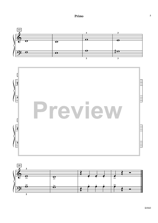 This elementary duet written for one piano four hands is in the key of A minor and 4/4 time. This piece offers an interesting contrast in articulations between the primo and secondo parts, giving each student an opportunity to play the melody.