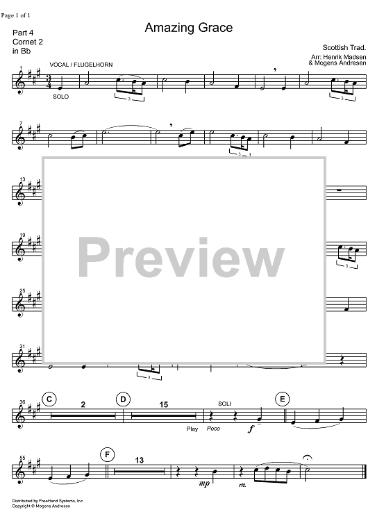 Digital Sheet Music for Amazing Grace - B-flat Cornet 2 by Mogens Andresen, Traditional scored for Brass Ensemble; id:324812