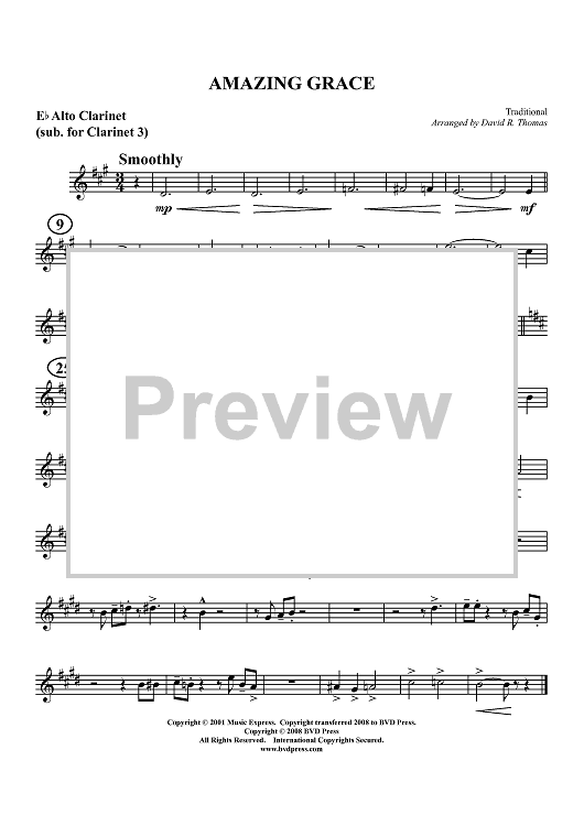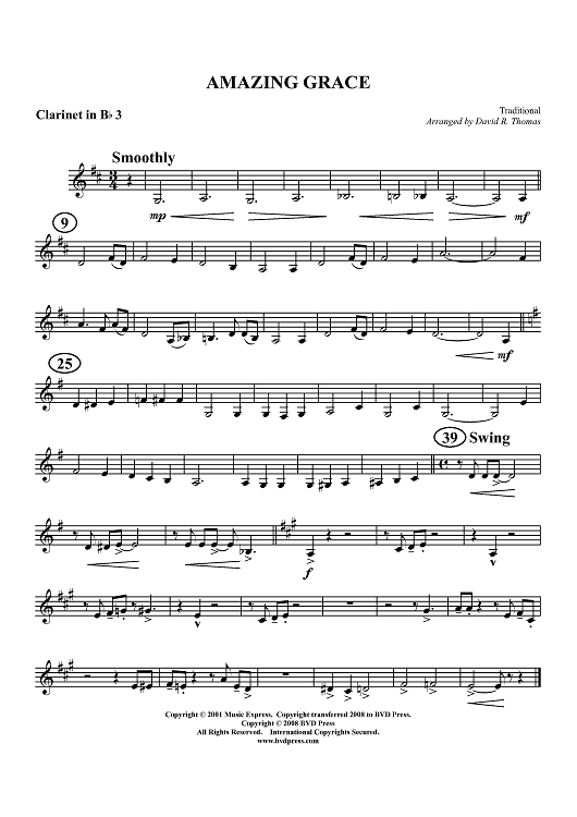 Digital Sheet Music for Amazing Grace - Clarinet 3 in B-flat (op. Alto Cl.) by Traditional, David R. Thomas scored for Clarinet Quartet; id:404932