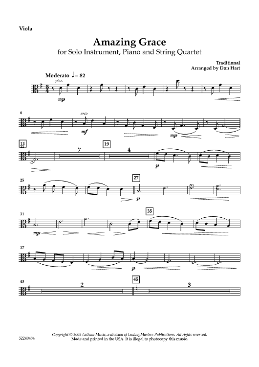 Digital Sheet Music for Amazing Grace - for Solo Instrument, Piano and String Quartet - Viola by , Traditional, Don Hart scored for String Quartet; id:458913