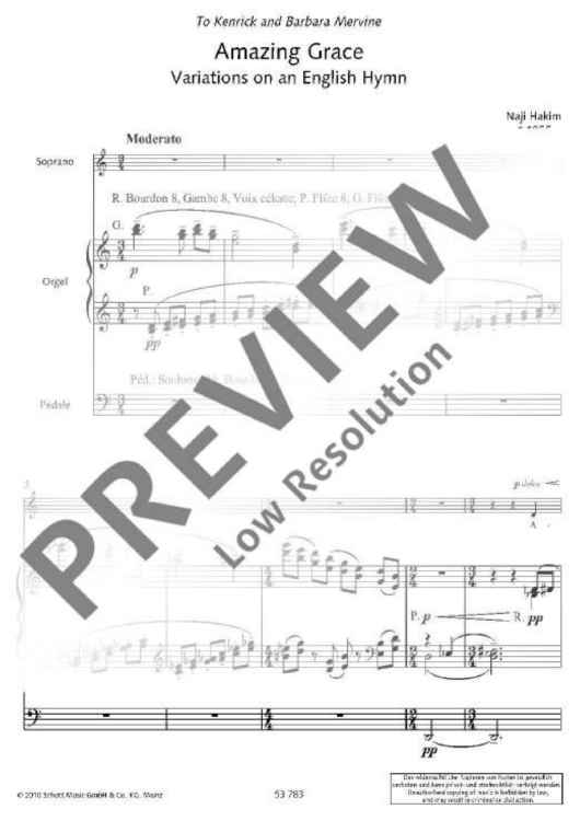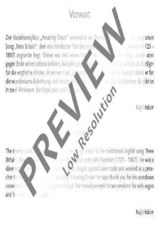 Naji Hakim, geboren 1955 in Beirut, gehört zu den bedeutendsten Organisten und Orgelkomponisten der Gegenwart. Er studierte bei Jean Langlais am Conservatoire in Paris und war von 1985-93 Organist an Sacré-Coeur in Paris, anschließend als Nachfolger Messiaens an der Basilika SteTrinité. Er konzertiert weltweit, wirkt als Professor am Conservatoire in Boulogne und hat eine Gastprofessur an der Royal Academy in London. Der Variationszyklus "Amazing Grace" verwendet als Thema den traditionellen englischen Song "New Britain", dem ein christlicher Text des englischen Dichters John Newton (1725-1807) zugrunde liegt. Dieser war zeit seines Lebens als Sklavenhändler tätig, wurde aber gegen Ende seines Lebens bekehrt, kämpfte gegen den Sklavenhandel und wirkte als Prediger für die englische Kirche. In seinem Lied "Amazing Grace" (Erstaunliche Gnade) dankt er für die wundersame Bekehrung und beschreibt sie als Gnade Gottes. Hakim komponierte die Variationen für Orgel solo (ED 20862) und für Sopran und Orgel (ED 20831).