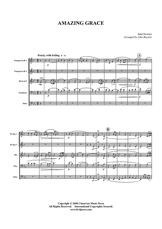 Digital Sheet Music for Amazing Grace - Score by , John Newton, John Beyrent scored for Brass Quintet; id:416259