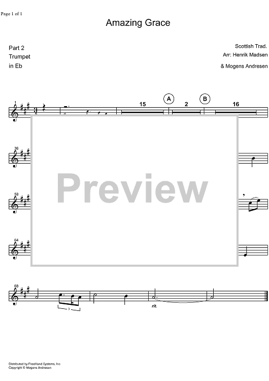 Digital Sheet Music for Amazing Grace - Trumpet in E-flat by Mogens Andresen, Traditional scored for Brass Ensemble; id:324810