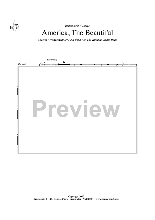 Digital Sheet Music for America, The Beautiful - Cymbals and Field Drum by Samuel A. Ward, Paul Bara scored for Brass Ensemble; id:428609