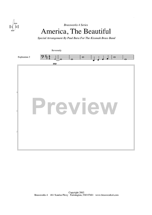 Digital Sheet Music for America, The Beautiful - Euphonium 2 by Samuel A. Ward, Paul Bara scored for Brass Ensemble; id:428606