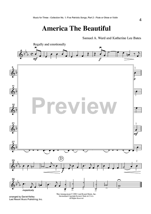 Digital Sheet Music for America The Beautiful - Part 2 Flute, Oboe or Violin by , Samuel A. Ward, Katherine Lee Bates, Daniel Kelley scored for Instrumental Trio; id:421582