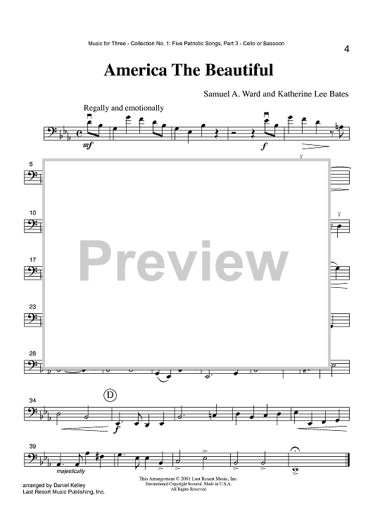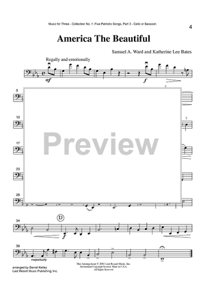 Digital Sheet Music for America The Beautiful - Part 3 Cello or Bassoon by , Samuel A. Ward, Katherine Lee Bates, Daniel Kelley scored for Instrumental Trio; id:421585