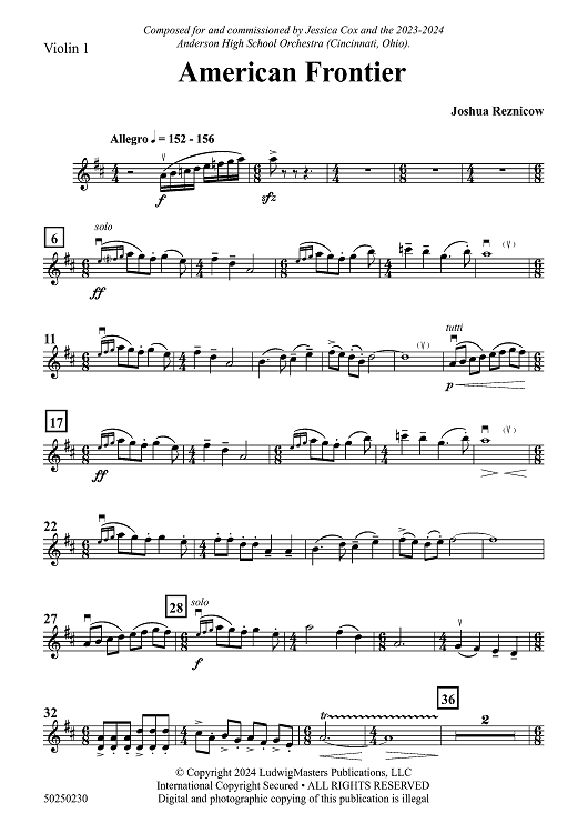 Digital Sheet Music for American Frontier - Violin 1 by Joshua Reznicow scored for Orchestra; id:504609