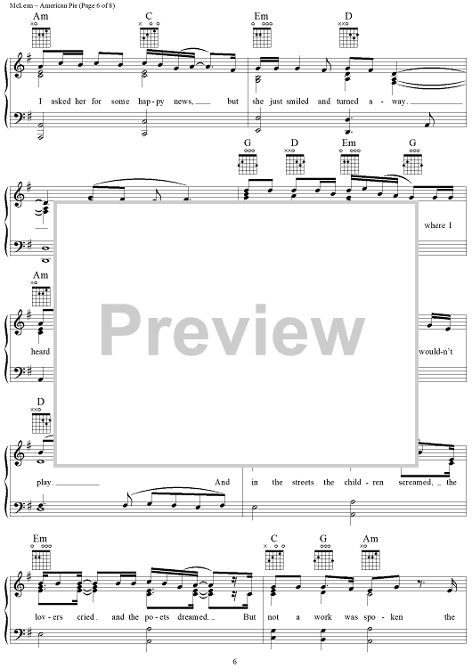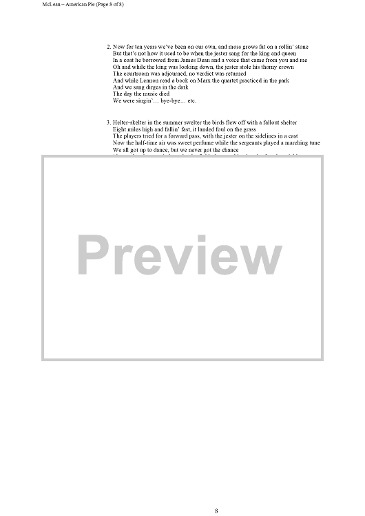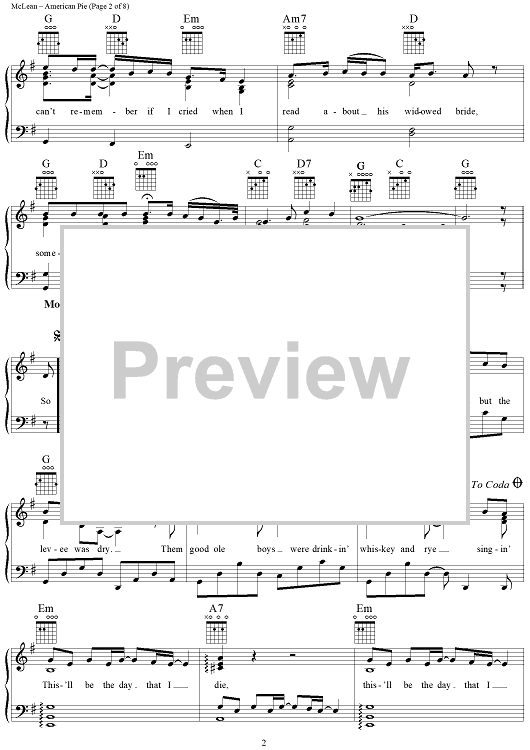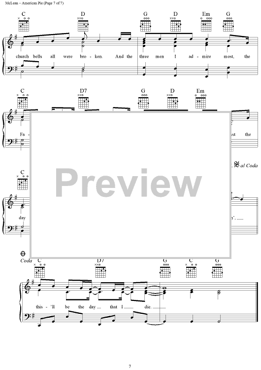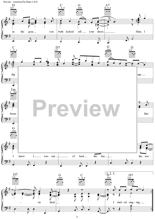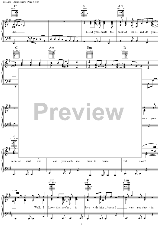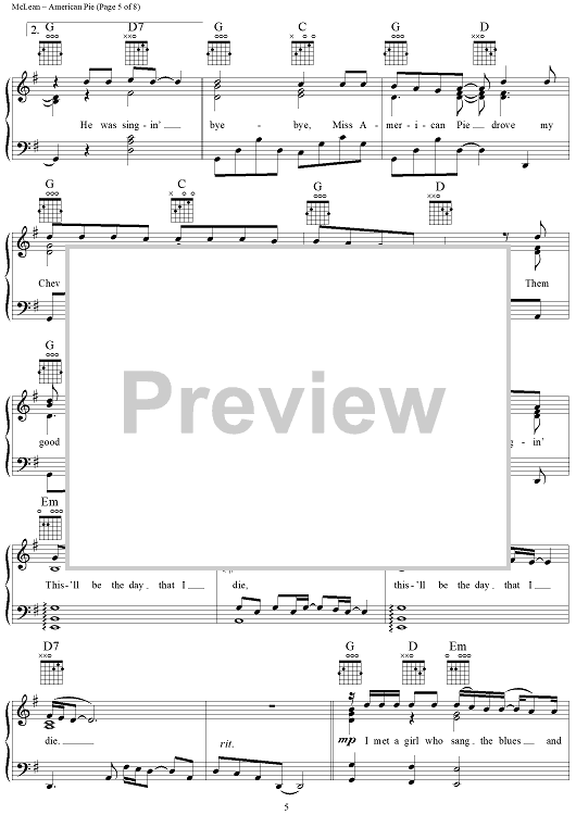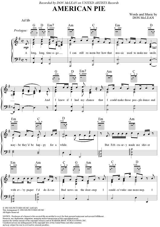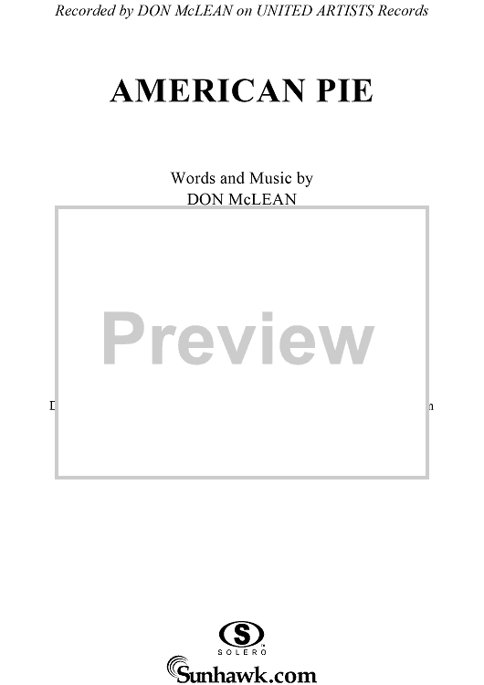 Digital Sheet Music for American Pie by Don McLean scored for Piano/Vocal/Chords; id:307421