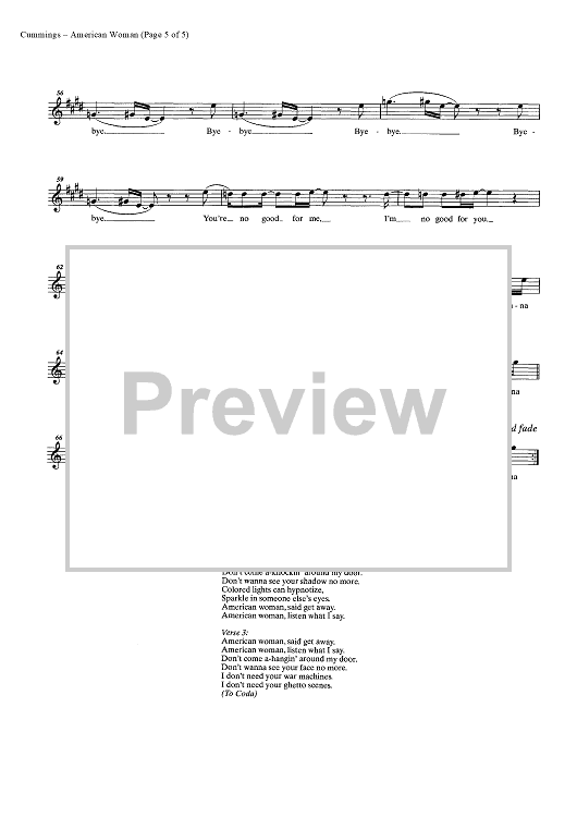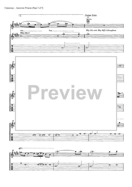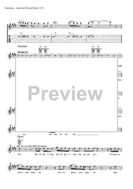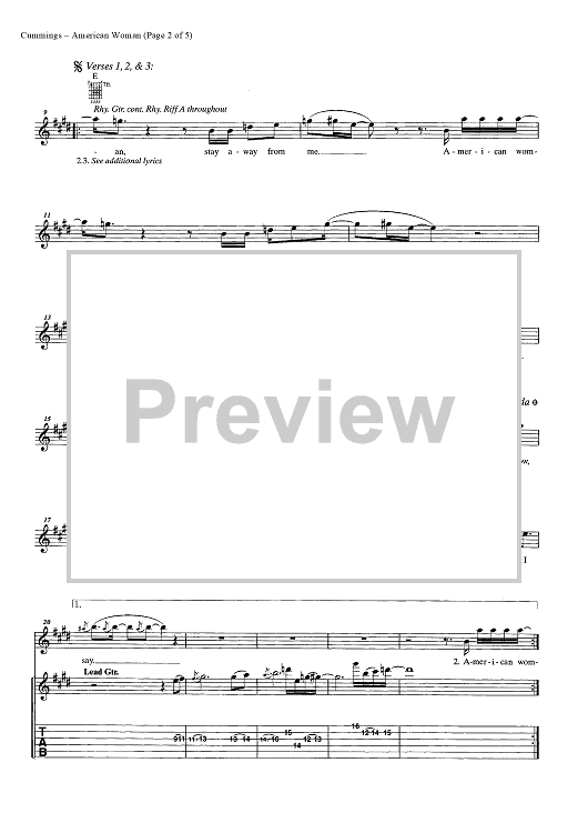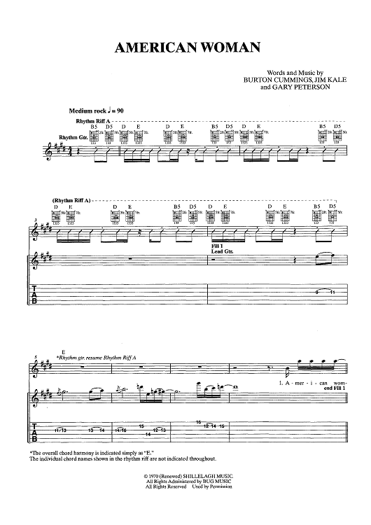 Digital Sheet Music for American Woman by Burton Cummings, Jim Kale, Gary Peterson, The Guess Who scored for Easy Guitar Tab/Vocal/Chords; id:448120