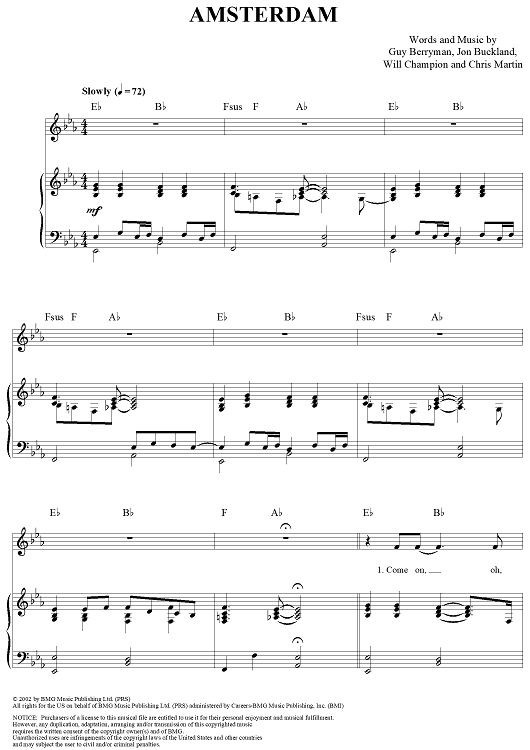 Digital Sheet Music for Amsterdam by Chris Martin, Coldplay, Jonny Buckland, Guy Berryman scored for Piano/Vocal/Chords; id:321316