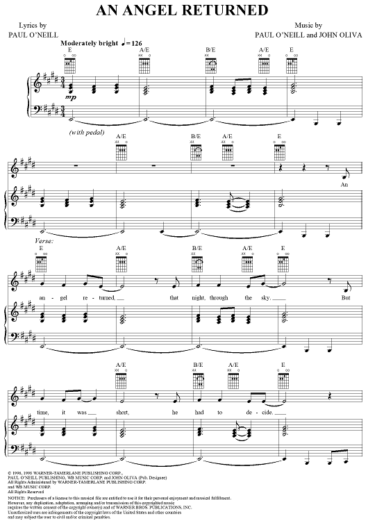Digital Sheet Music for An Angel Returned by Trans-Siberian Orchestra, Paul O'Neill, John Oliva scored for Piano/Vocal/Chords; id:252956